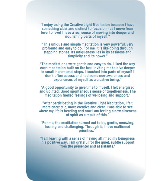 Meditation assists in subduing the mind and emotions and, at that quiet point of experience, potential of its own nature and energy manifests. The Creative Light Meditation course gives you a meditation practice that can be simply and easily used in your own time. You are gently guided through positive levels of your inner consciousness, and gain techniques that activate these creative aspects of yourself. Participating in this course also balances the energies of your body making it easier to establish direction in your daily life that is affirmative. The Creative Light Meditation is available in a weekly or weekend format.